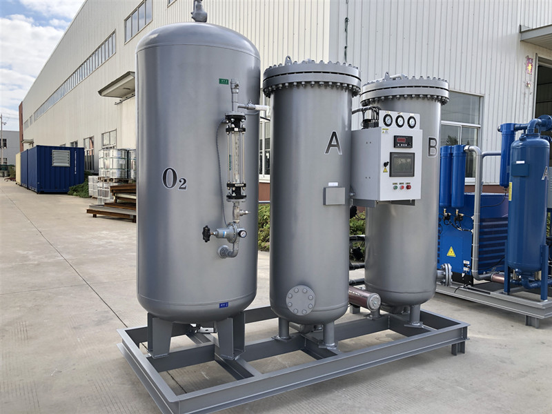 變壓吸附制氧裝置以潔凈的壓縮空氣為原料,采用高品質(zhì)的沸石分子篩作為吸附劑,在一定的壓力下,從空氣中制取氧氣。經(jīng)過純化干燥的壓縮空氣,在吸附器中進行加壓吸附、減壓脫附。由于空氣動力學效應,氮在沸石分子篩微孔中擴散速率遠大于氧,氮被沸石分子篩優(yōu)先吸附,氧在氣相中被富集起來,形成成品氧氣。然后經(jīng)減壓至常壓,吸附劑脫附所吸附的氮氣等雜質(zhì),實現(xiàn)再生。一般在系統(tǒng)中設置兩個吸附塔,一塔吸附產(chǎn)氧,另一塔脫附再生,通過PLC程序控制器控制氣動閥的啟閉,使兩塔交替循環(huán),從而取得純度較高的氧氣(93%±3%)。